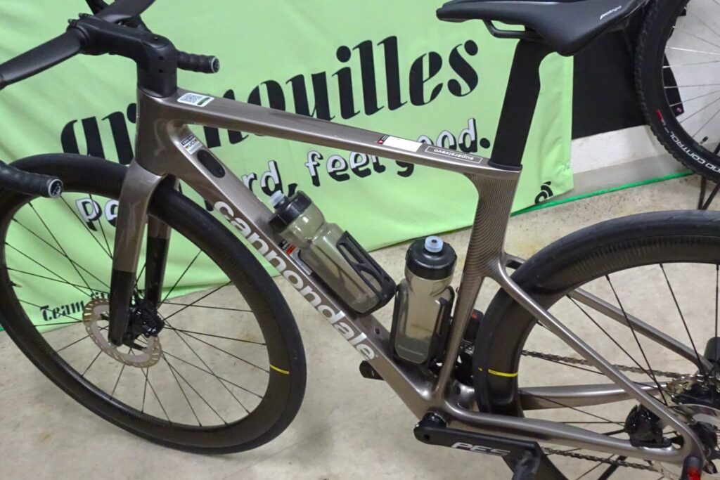 このフレームはボトルとボトルケージが2セット付属します。S6Evoのフレーム幅に合わせて設計されたエアロボトルです。空力云々は置いといて、「俺のS6Evoと同時に設計されたボトルなんだ」ってのが気分を高めてくれます。別で買えば1万円以上する装備なので嬉しいオマケです。