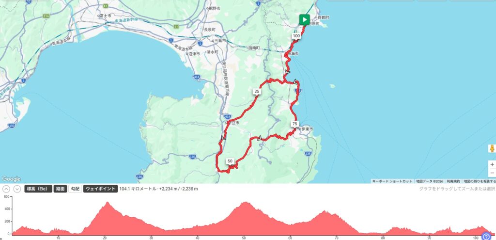 久し振りに定休日ライドは伊豆半島の北東エリア。湯河原を起点に熱海~修善寺~月ヶ瀬~伊東を巡る、距離104km・獲得標高2千mのルート